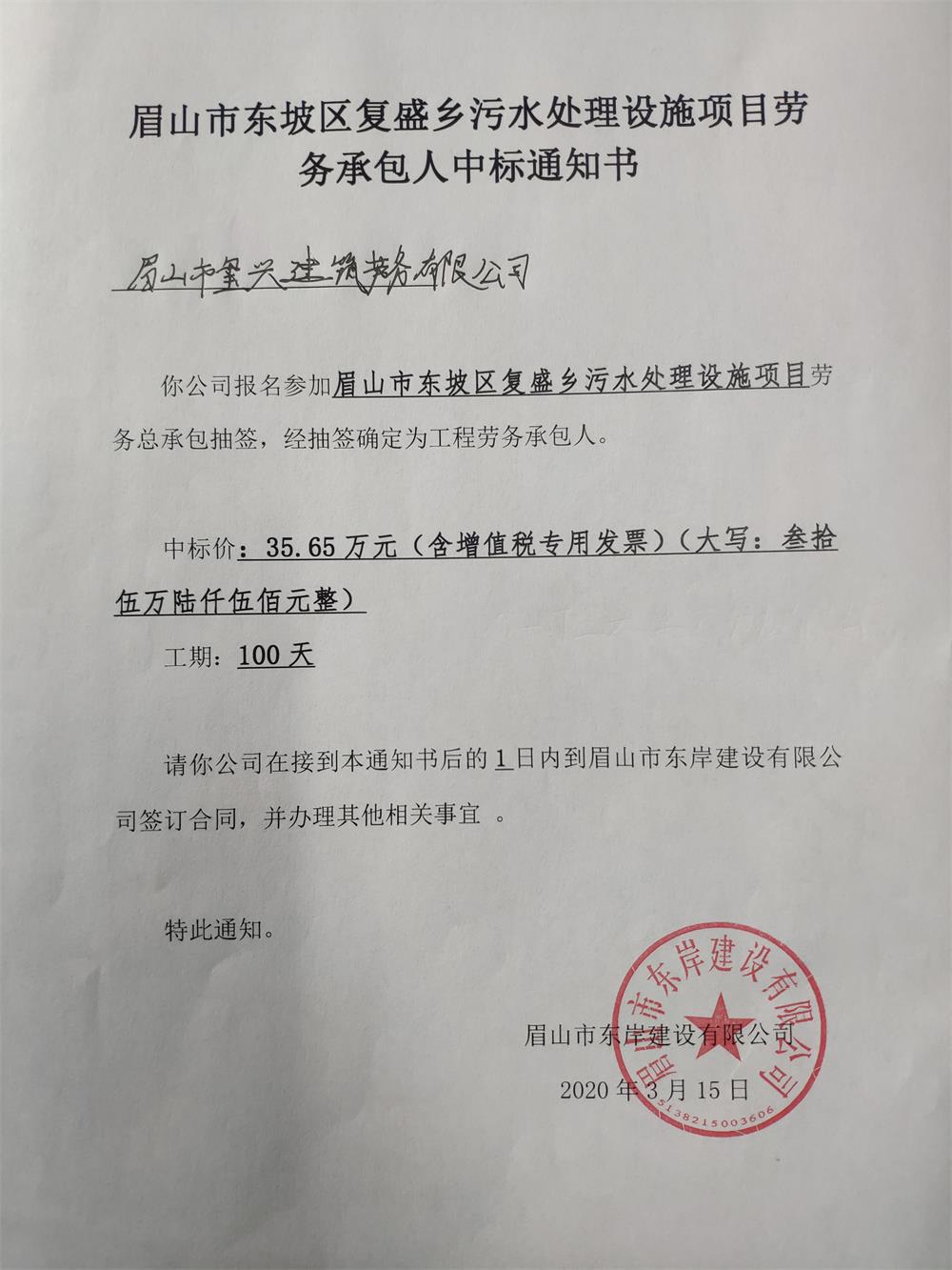 眉山市東坡區(qū)復盛鄉(xiāng)污水處理設(shè)施項目中標通知