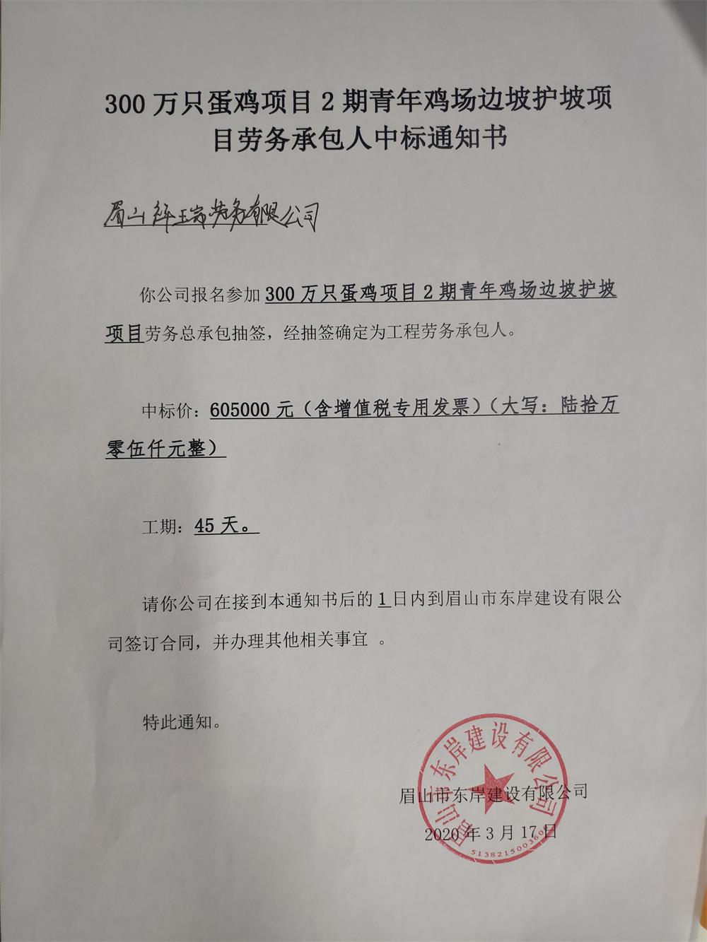 300萬只蛋雞項(xiàng)目2期青年雞場邊坡護(hù)坡項(xiàng)目中標(biāo)通知