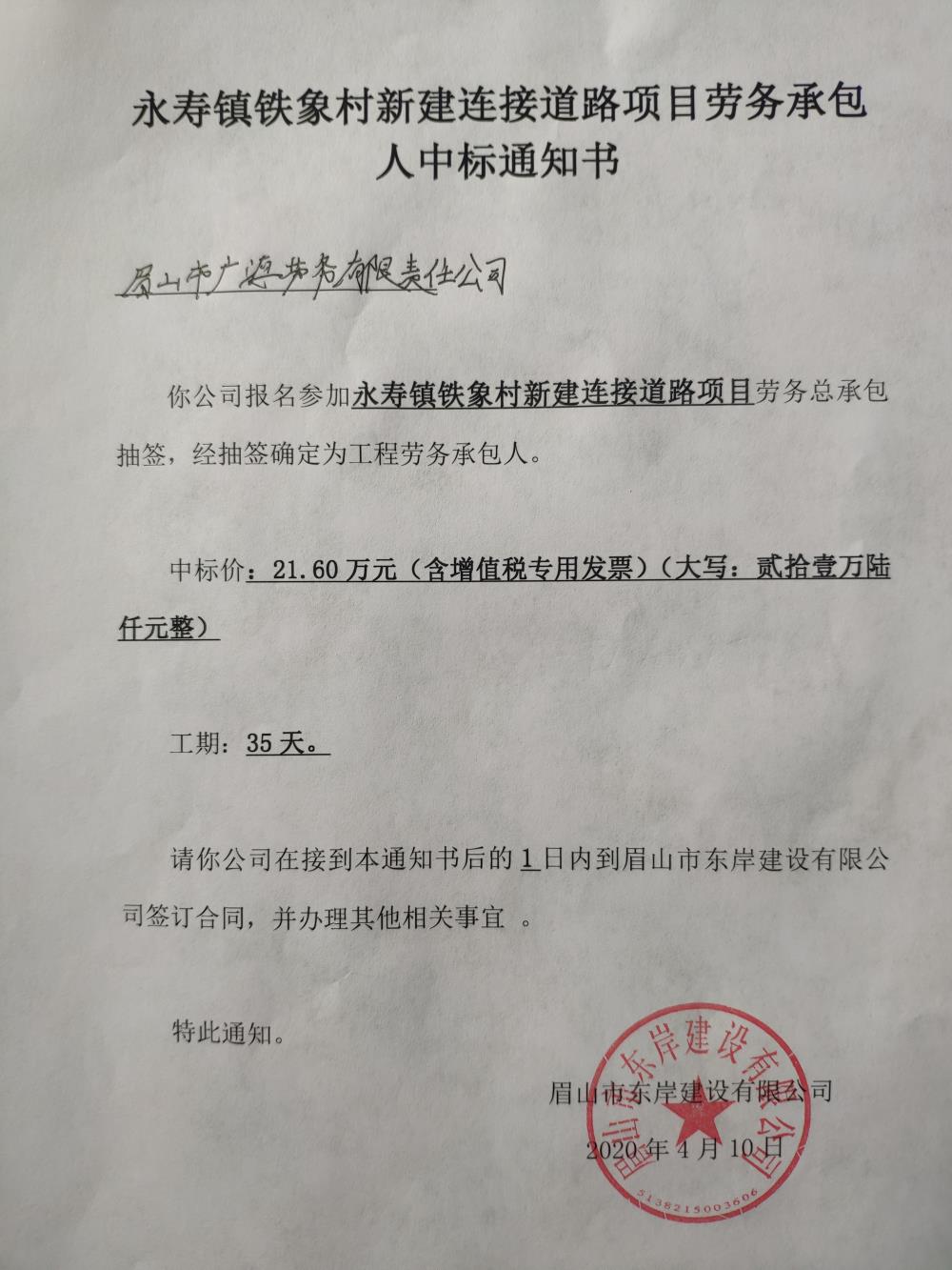 永壽鎮(zhèn)鐵象村新建連接道路項(xiàng)目中標(biāo)通知