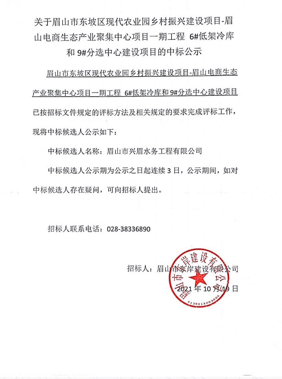 眉山市東坡區(qū)現(xiàn)代農(nóng)業(yè)園鄉(xiāng)村振興建設(shè)項(xiàng)目-眉山電商生態(tài)產(chǎn)業(yè)聚集中心項(xiàng)目一期工程 6#低架冷庫(kù)和9#分選中心建設(shè)項(xiàng)目中標(biāo)公示